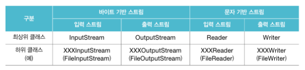 -바이트 기반 스트림 : 그림, 멀티미디어 등의 바이너리 데이터를 읽고 출력할 때 사용