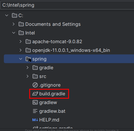 IntelliJ 접속 후 Open Project를 클립하여 압축파일을 푼곳을 찾아가 build.gradle 파일을 열어준다!