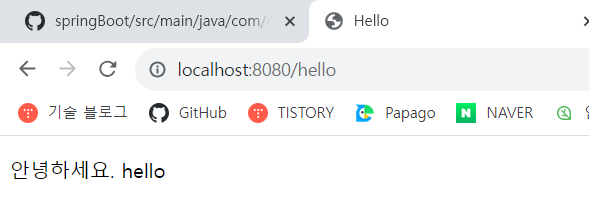 data라는 키에 hello라는 값을 model에 담아 hello.html파일로 리턴한다는 controller 구문!