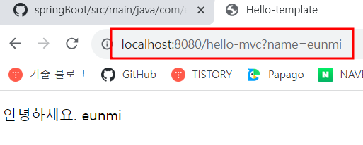 @RequestParam("name")으로 변수명이 name인 매개변수 값을 넣어 줘야하기 때문에 주소인 hello-mvc 뒤에 ?를 통해 매개변수를 넘겨준다 변수 name=eunmi라는 매개변수를 넣어주면 그것이 컨트롤러에서 String name으로 담겨 컨트롤러로 넘어가고, 그게 다시 모델에 담겨 hello-template.html로 갔기 때문에 페이지에 안녕하세요. eunmi가 출력될 수 있었다.