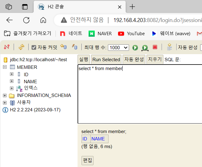 insert into member(name) values("spring")라고 ""쓰면 에러.. 꼭 작은따옴표..